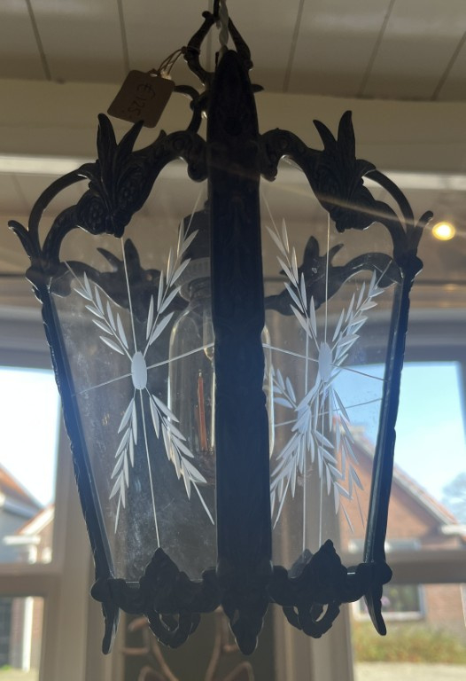 Prachtige Antieke Lantaarn Hanglamp – Geëtst Glas & Smeedwerk