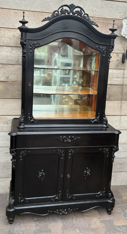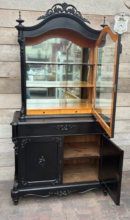 Deze elegante vitrinekast is een echte eyecatcher en uitgevoerd in de rijke, klassieke Napoleon III / neo-barok stijl. De diepzwarte buitenzijde in combinatie met het warme houten interieur zorgt voor een prachtig contrast en een luxe uitstraling.