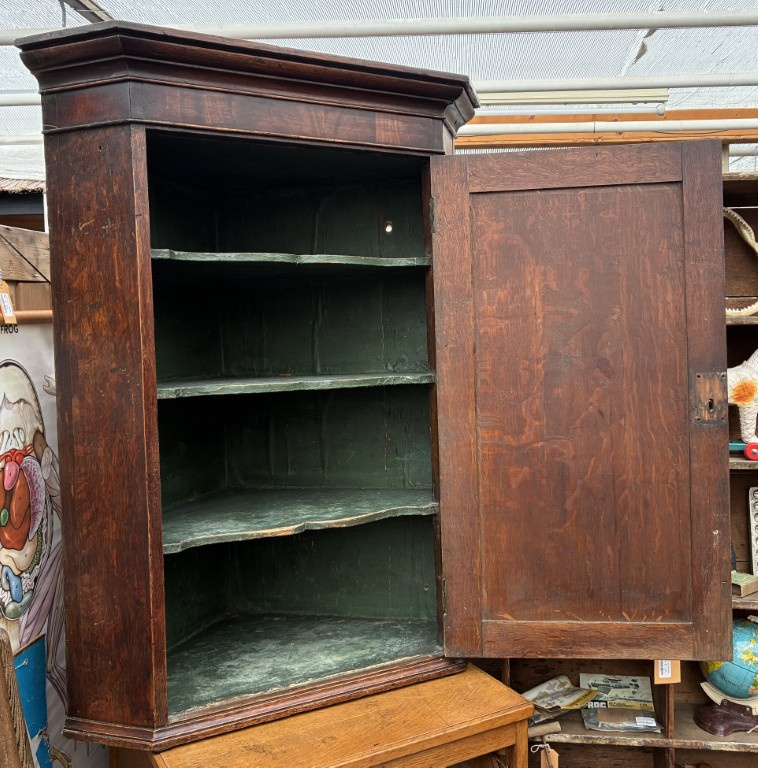 Prachtig authentiek Engels hoekkastje (hangmodel) uit de vroege 19e eeuw. Dit karaktervolle meubelstuk is vervaardigd uit massief eikenhout en verkeert in een mooie, doorleefde staat.