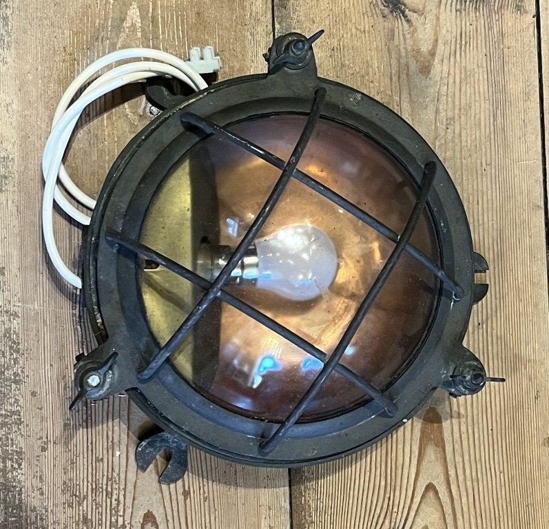 OverzichtAntieke messing bullseye lamp, ook wel bekend als een patrijspoortlamp of machinekamerlamp. Dit type verlichting is oorspronkelijk ontworpen voor gebruik op schepen en in industriële omgevingen vanwege de robuuste, waterdichte constructie.