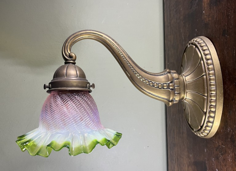 - Glazen kap: De kap is uitgevoerd in een tulipvorm met een geschulpte rand ("piecrust edge"). Het glas is vaak tweekleurig, zoals hier in roze en wit met een contrasterende groene rand, wat zorgt voor een zacht en diffuus licht.