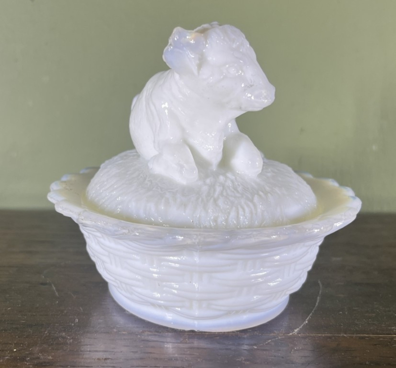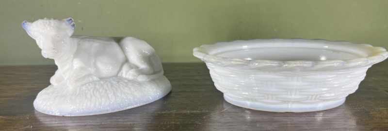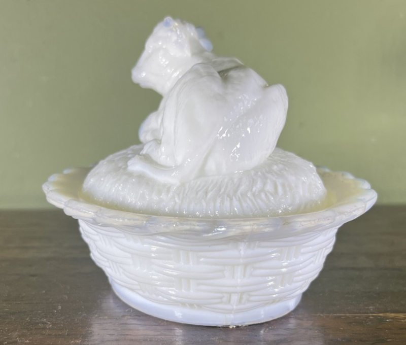 - Ontwerp: De deksel toont een gedetailleerde figuur van een koe die rust op een bed van gras. De onderzijde van de vloot heeft een reliëfpatroon dat lijkt op een gevlochten mandje (basketweave).