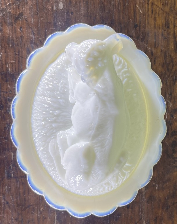 OverzichtAntieke of vintage melkglazen botervloot (of 'covered dish') in de vorm van een liggende koe, een klassiek verzamelobject uit de late 19e of vroege 20e eeuw.
