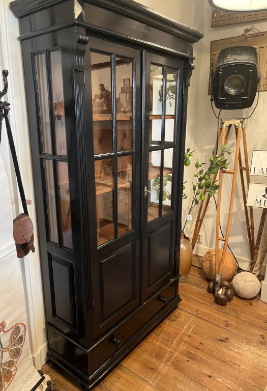 Prachtige Antieke Zwarte Vitrinekast / BuffetkastDeze statige kast is uitgevoerd in een diepzwarte kleur met een zijdeglans afwerking, wat zorgt voor een chique en authentieke look. Het model doet denken aan de klassieke Engelse 'ebonised' kasten en past perfect in zowel een…