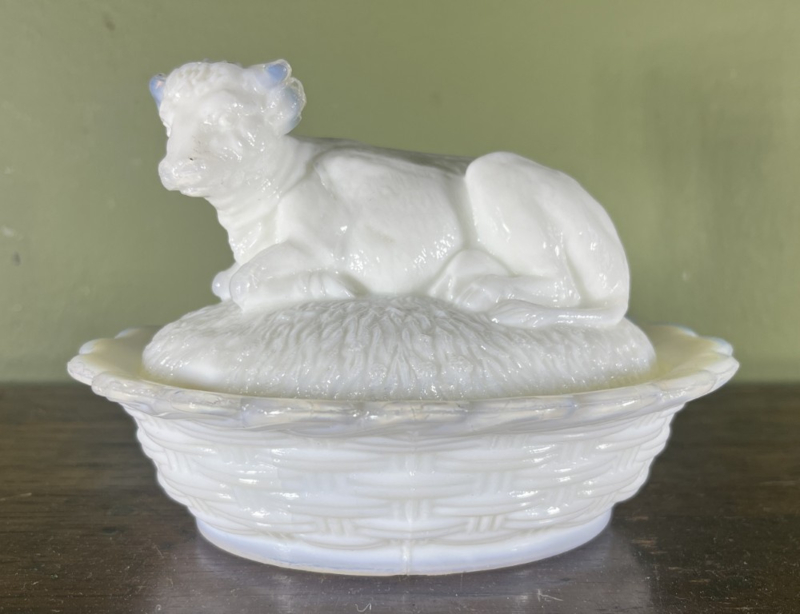 Vintage melkglazen botervlootAntieke of vintage melkglazen botervloot (of 'covered dish') in de vorm van een liggende koe, een klassiek verzamelobject uit de late 19e of vroege 20e eeuw.
