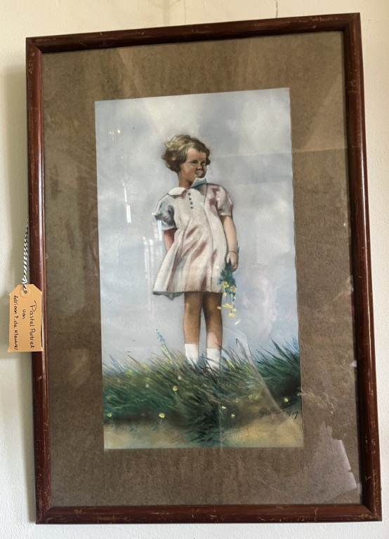 Antiek Pastelportret: Meisje met Bloemen in het Veld (Adriana P. de Kleuver)Breng een stukje nostalgie in huis met dit authentieke, handgetekende pastelportret.