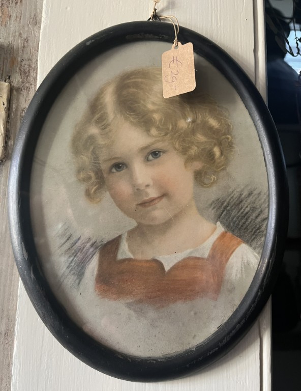 Antiek Portret in Ovalen Lijst: Meisje met Blonde KrullenGeef je interieur een vleugje nostalgie met dit prachtige, antieke portret.