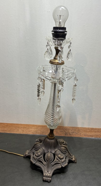 Unieke Antieke 'Girandole' Tafellamp – Kristal met Gietijzeren MaskervoetUnieke Antieke 'Girandole' Tafellamp – Kristal met Gietijzeren Maskervoet