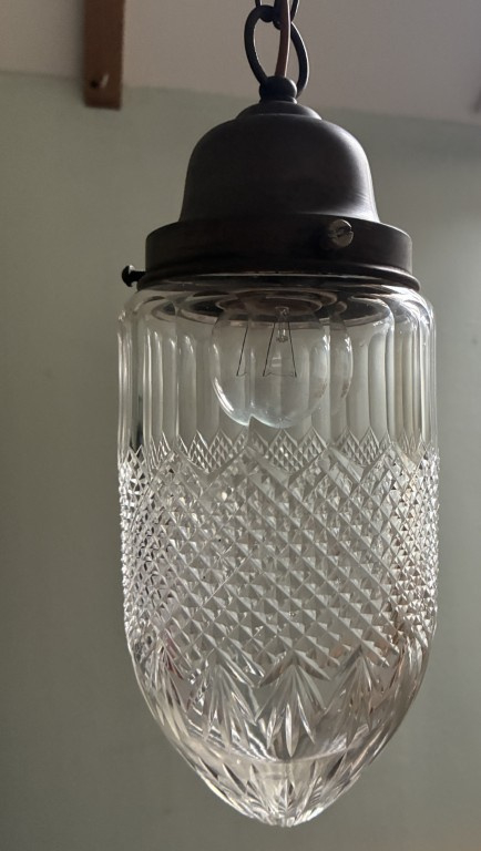 Antieke 'Eikel' Hanglamp – Geslepen Glas met Unieke SchakelkettingBreng de charme van vroeger in huis met deze schitterende antieke hanglamp. De glazen kap is uitgevoerd in een klassieke eikelvorm en is voorzien van prachtig gedetailleerd geslepen kristalglas, wat zorgt voor een sfeervolle…